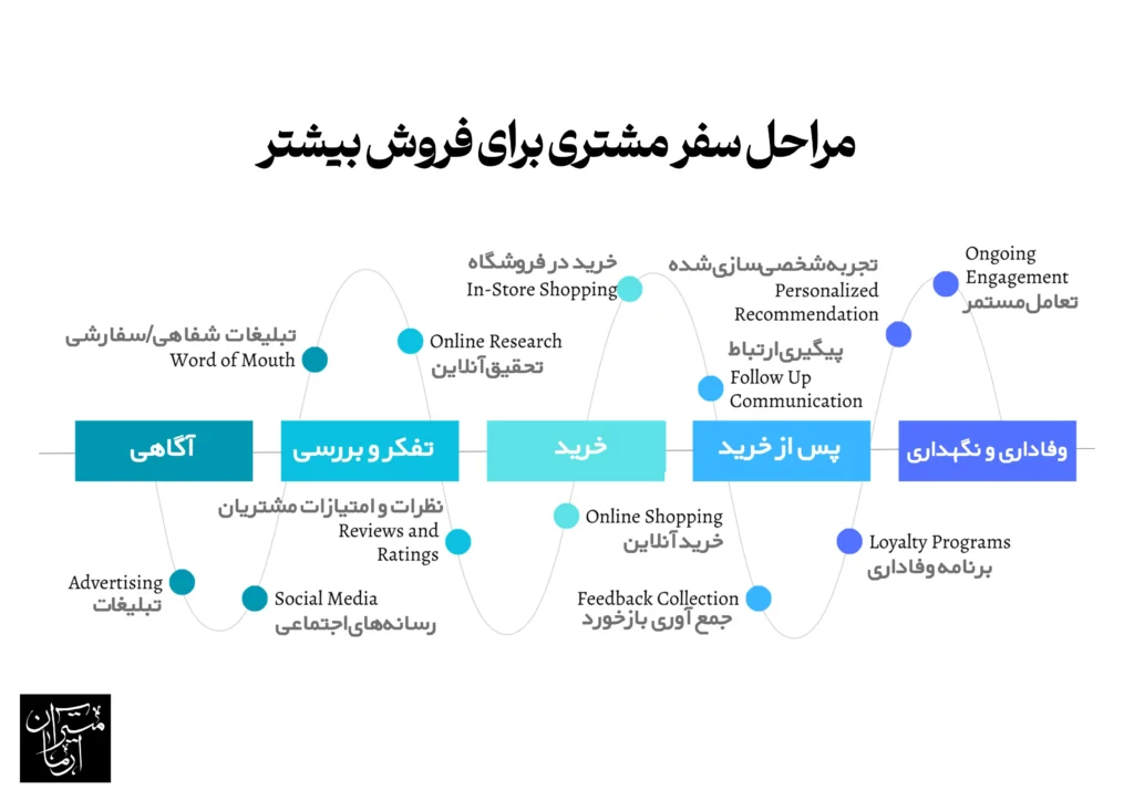 - مراحل سفر مشتری: آگاهی → بررسی → تصمیم